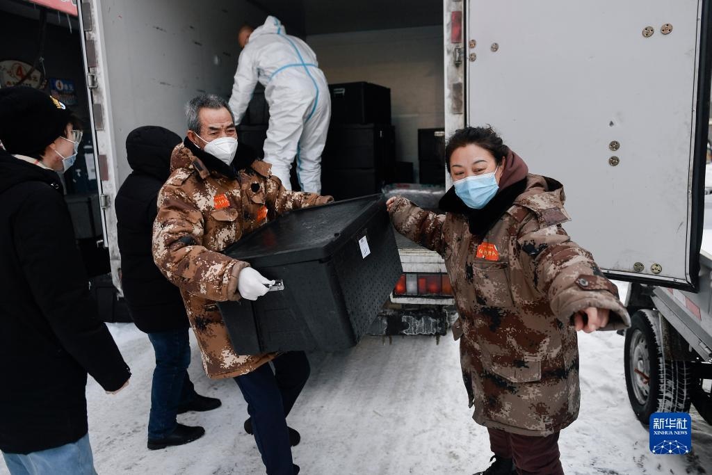趙淑華(右一)指揮社區(qū)工作人員和志愿者搬運(yùn)盒飯(2021年2月15日攝)。趙淑華是吉林省通化市東昌區(qū)團(tuán)結(jié)街道文化社區(qū)副主任、網(wǎng)格長,臨近退休的她毫不猶豫投身抗疫一線。新華社記者 許暢 攝