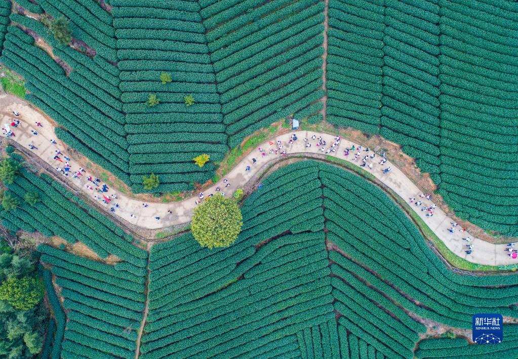 團(tuán)隊(duì)游客在杭州市富陽區(qū)拔山村萬畝茶山游覽(2018年3月26日攝,無人機(jī)照片)。浙江省“千村示范、萬村整治”工程撬動了鄉(xiāng)村從美麗生態(tài)到美麗經(jīng)濟(jì),再到美好生活的良性循環(huán)。2018年,浙江“千萬工程”獲得聯(lián)合國“地球衛(wèi)士獎(jiǎng)”中的“激勵(lì)與行動獎(jiǎng)”。新華社記者 徐昱 攝