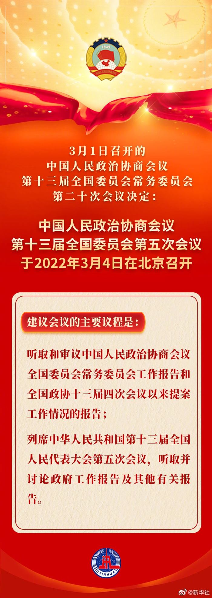 3月1日召開的中國人民政治協(xié)商會議第十三屆全國委員會常務(wù)委員會第二十次會議決定:中國人民政治協(xié)商會議第十三屆全國委員會第五次會議于2022年3月4日在北京召開。建議會議的主要議程是:聽取和審議中國人民政治協(xié)商會議全國委員會常務(wù)委員會工作報(bào)告和全國政協(xié)十三屆四次會議以來提案工作情況的報(bào)告;列席中華人民共和國第十三屆全國人民代表大會第五次會議,聽取并討論政府工作報(bào)告及其他有關(guān)報(bào)告。