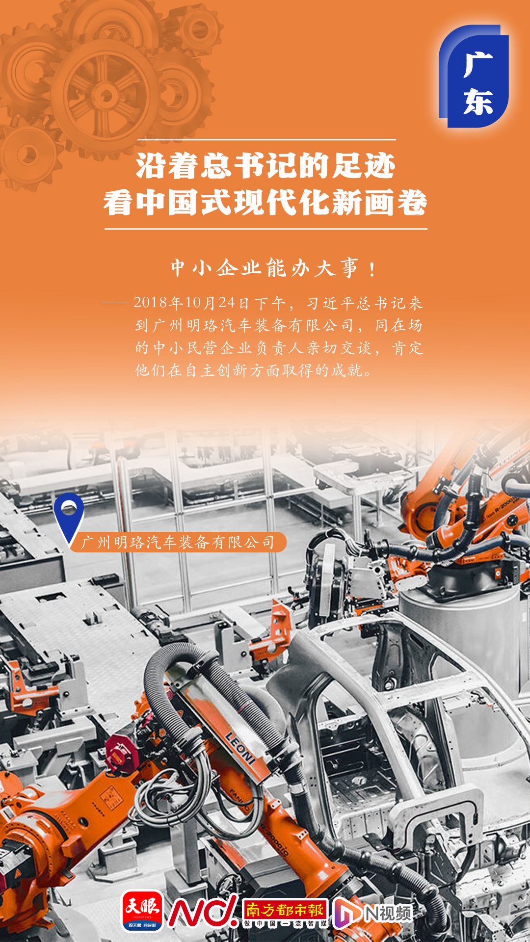“中小企業(yè)能辦大事!”2018年10月24日下午,習(xí)近平總書(shū)記來(lái)到廣州明珞汽車(chē)裝備有限公司,同在場(chǎng)的中小民營(yíng)企業(yè)負(fù)責(zé)人親切交談,肯定他們?cè)谧灾鲃?chuàng)新方面取得的成就。