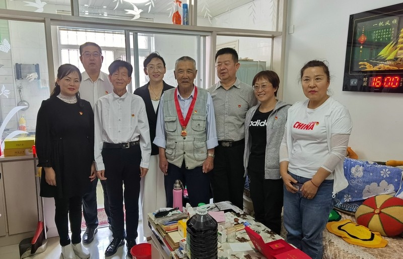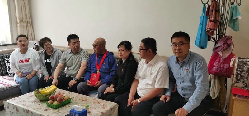 當(dāng)天下午,各黨組織代表共同來(lái)到阿左旗額魯特街道黨工委所屬社區(qū),入戶(hù)慰問(wèn)了3名老黨員與1名貧困戶(hù),為他們送去了生活物資,還為90歲高齡老黨員常根禎及86歲老黨員張世云佩戴了“光榮在黨五十年”榮譽(yù)勛章。幾位老黨員非常感動(dòng),給大家講起了自己當(dāng)年的故事。
