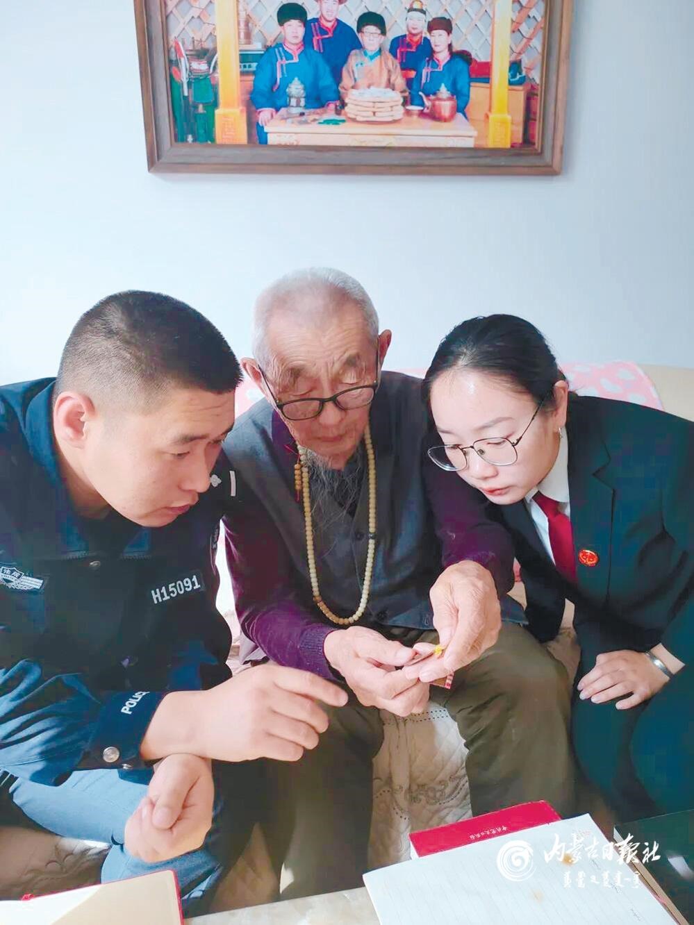老黨員為青年干警介紹自己獲得的勛章。近日,錫林郭勒盟蘇尼特左旗人民法院組織青年干警來到91歲的老黨員阿日德那巴吉爾家中,聆聽老人講述黨史故事,接受革命傳統(tǒng)教育。(內(nèi)蒙古日?qǐng)?bào)記者 李晗 攝)