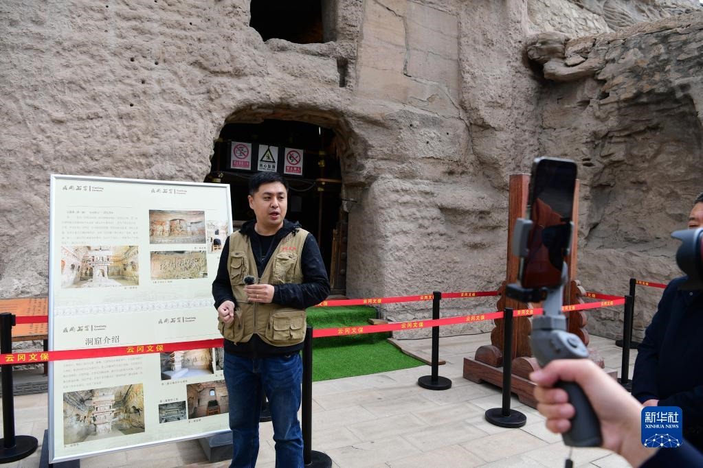 5月11日,云岡研究院工作人員孫波在云岡石窟第1窟進行文物保護專題直播。新華社記者 楊晨光 攝