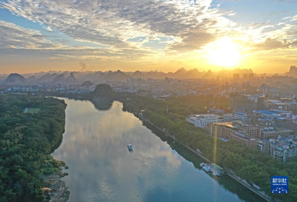 廣西桂林市城區(qū)漓江沿岸風光(2021年11月24日攝,無人機照片)。新華社記者 周華 攝