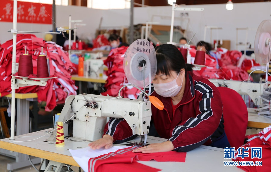 3月31日,呼和浩特市的服裝加工企業(yè)工人在校服生產線工作。連日來,呼和浩特市服裝加工企業(yè)在做好疫情防控工作同時,組織員工抓緊趕制校服,全力保障市場供應。新華網發(fā) (馮磊 攝)
