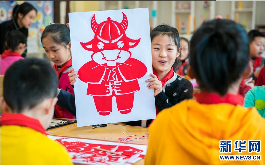 12月29日,呼和浩特市玉泉區(qū)恒昌店巷小學(xué)學(xué)生在展示以生肖“牛”為主題的剪紙作品。新華網(wǎng) 發(fā)(丁根厚 攝) -