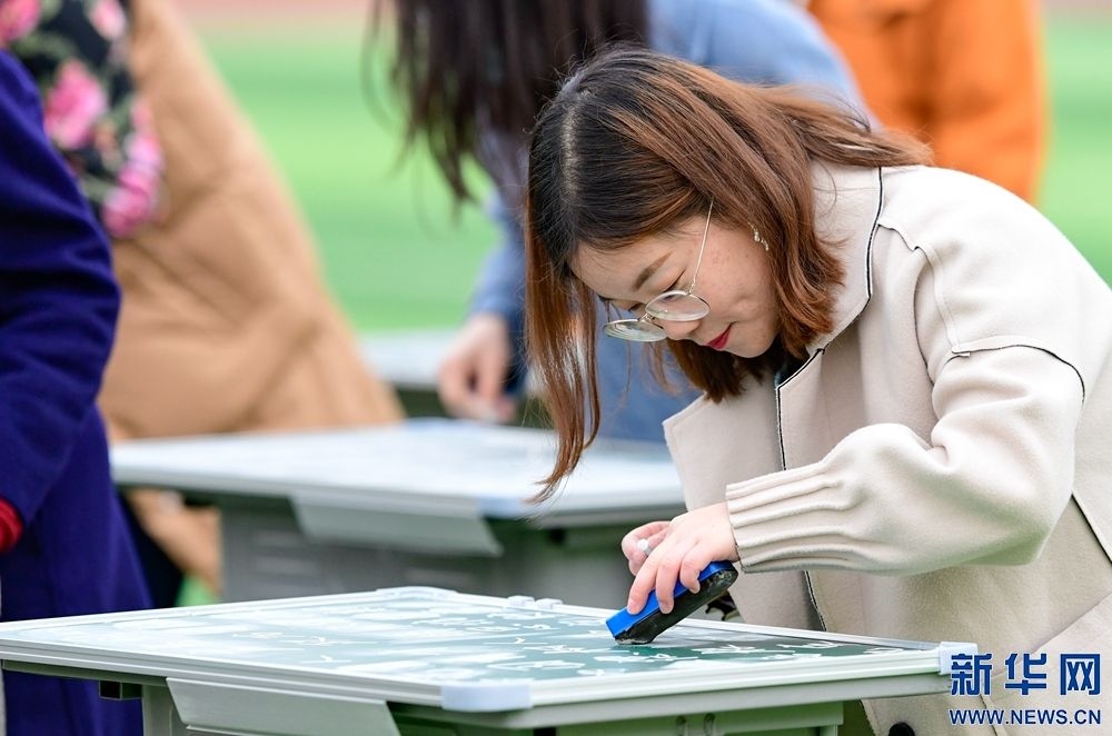 3月8日,呼和浩特市第三十八中學(xué)教師在板書(shū)比賽中。新華網(wǎng)發(fā)(王正 攝) -